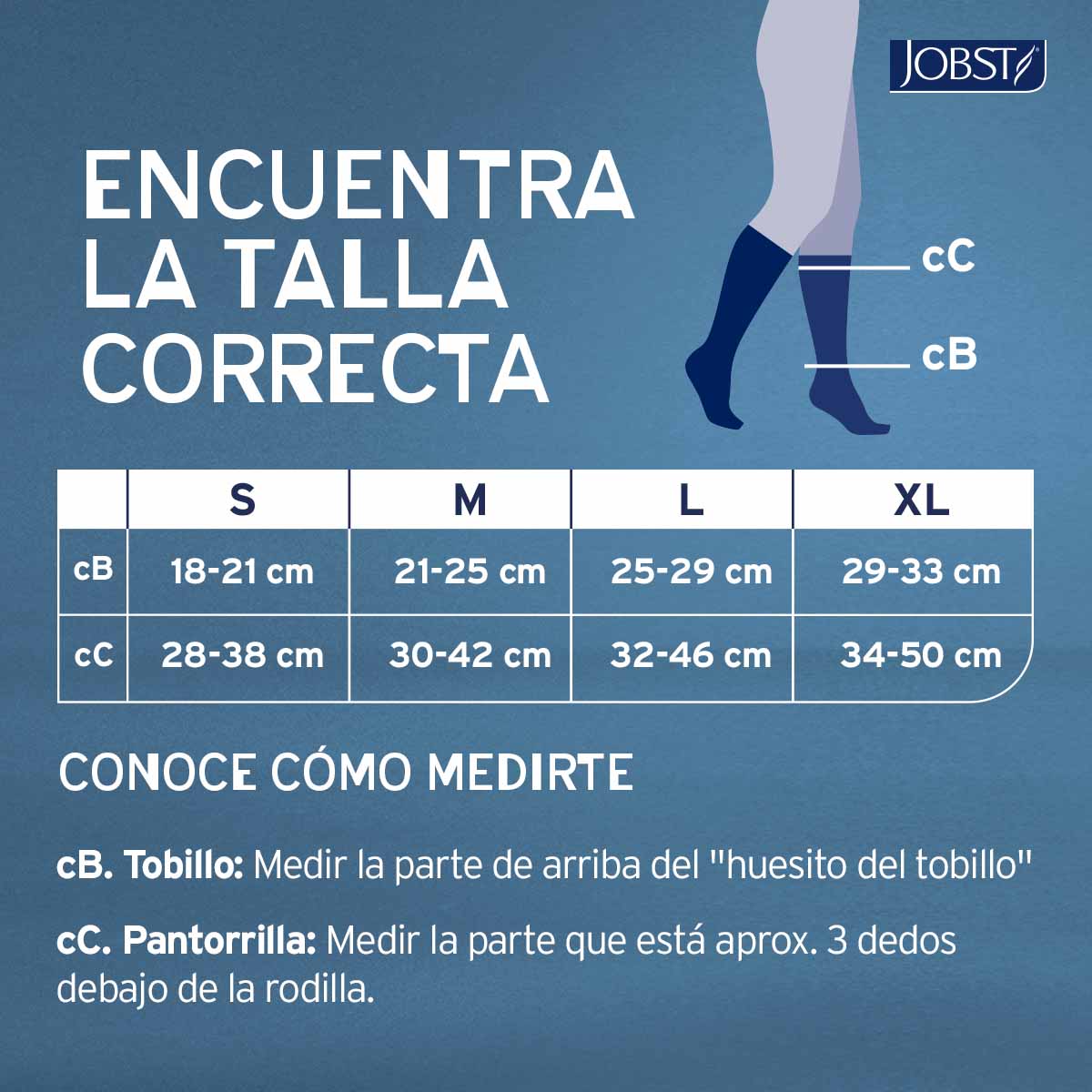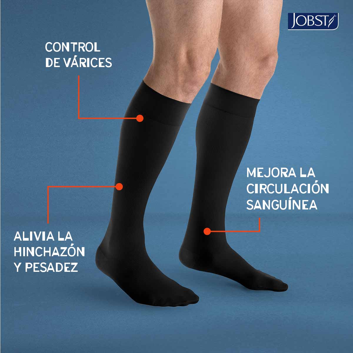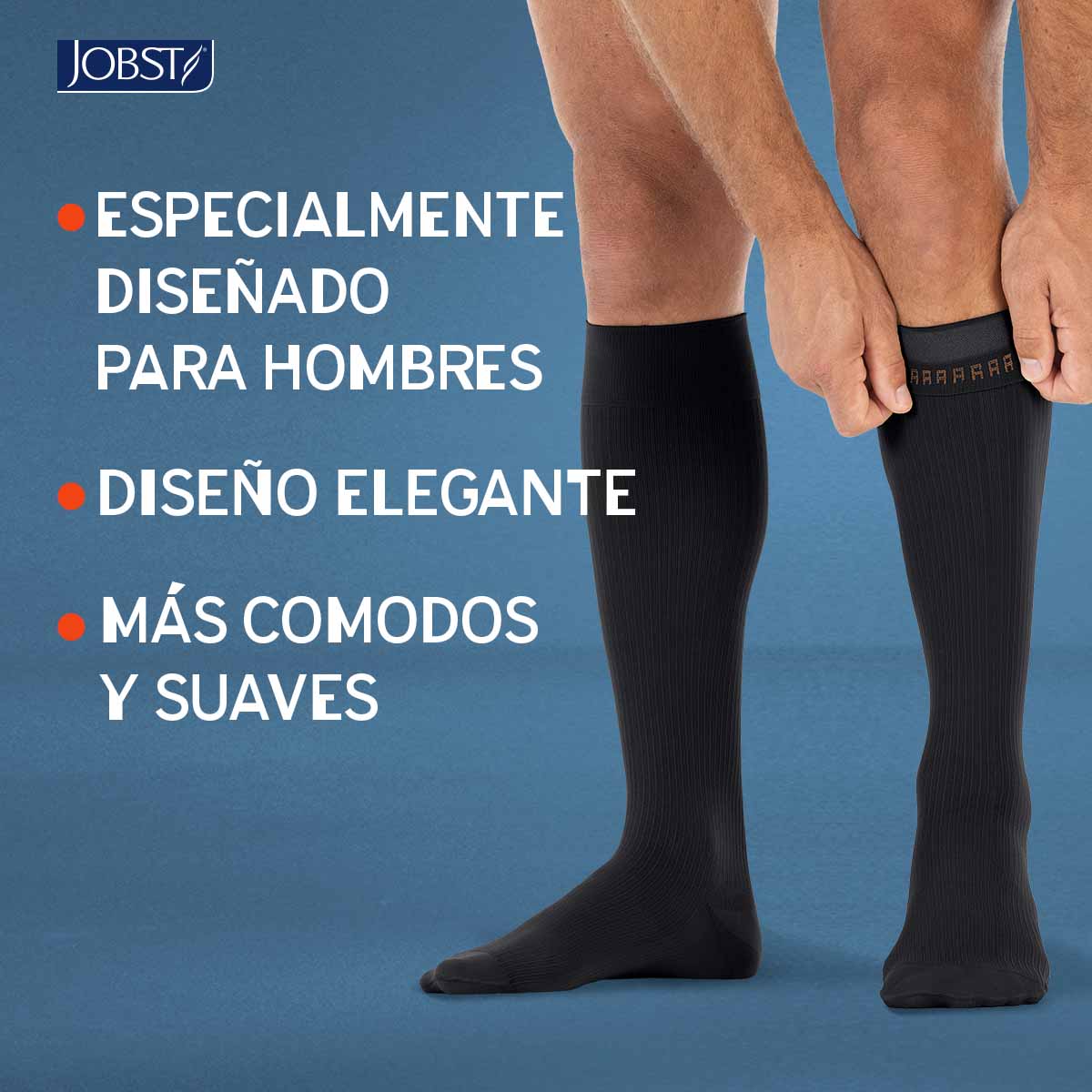 Calcetines de Compresión  JOBST For Men. Son calcetines de compresión de grado médico, para la prevención y tratamiento del paciente con insuficiencia venosa crónica, desde piernas cansadas o pesadas, presencia de arañitas vasculares, venas varicosas, edemas, cambios de coloración de la piel, hasta úlceras venosas cicatrizadas (desde etapa C0 A C5), diseñados especialmente para los hombres activos que ayudan a reducir los malestares y el dolor ocasionados por los problemas de circulación sanguínea. Están elaborados con tela liviana, tienen un acabado suave y cuentan con una banda en la rodilla que se ajusta a tu pierna brindándote una gran comodidad.